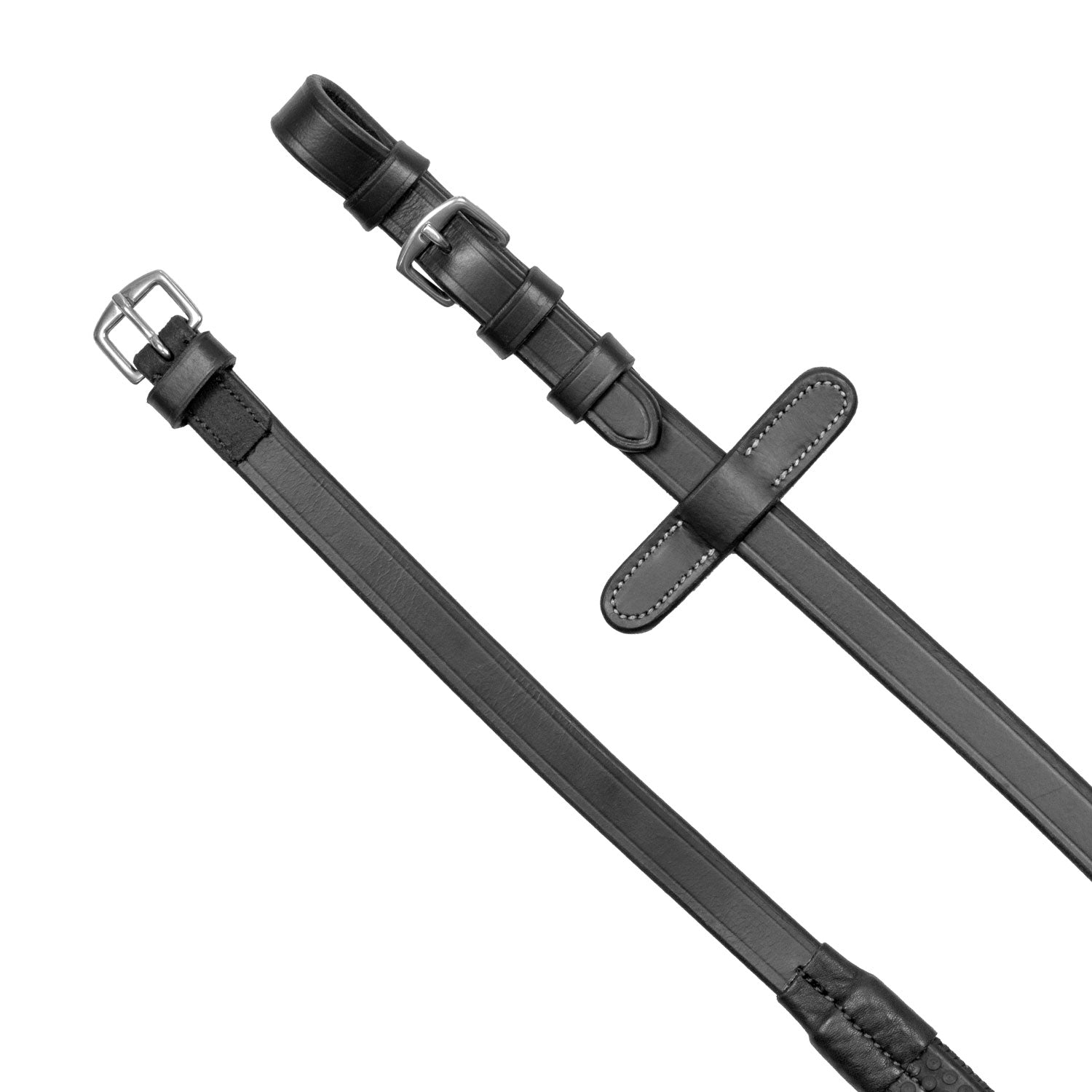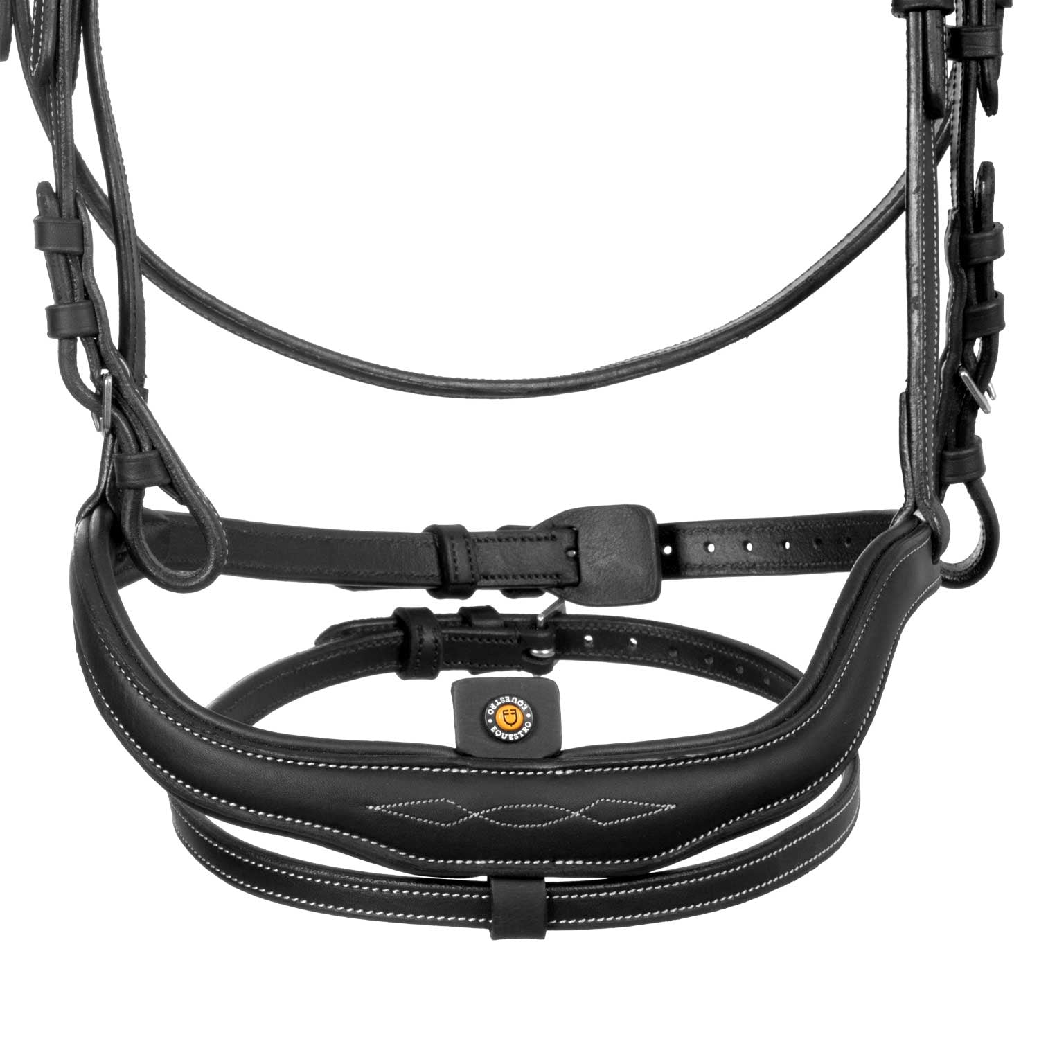 English bridle made of fine, soft leather, featuring stainless steel buckles for maximum durability and stability. The noseband, featuring an adjustable flash strap and padding, ensures optimal comfort and a perfect fit. Both the browband and noseband are embellished with embroidered motifs. The anatomical design of the headpiece evenly distributes pressure across the nape of the neck, ensuring maximum comfort for the horse. Reins are included for a complete set.