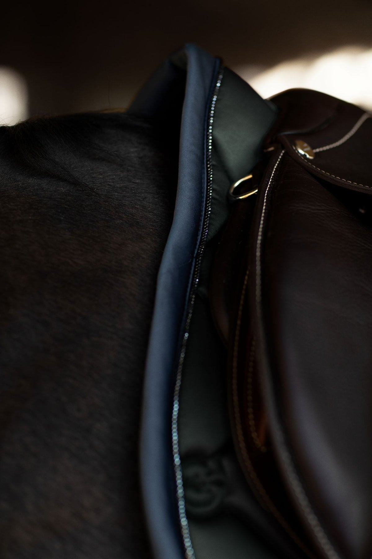 The Classic Jump Saddle Pad from Equestrian Stockholm is in a limited edition cool green, finished off with asphalt blue/grey edging and a thick black glittering piping that is intertwined with silver thread.