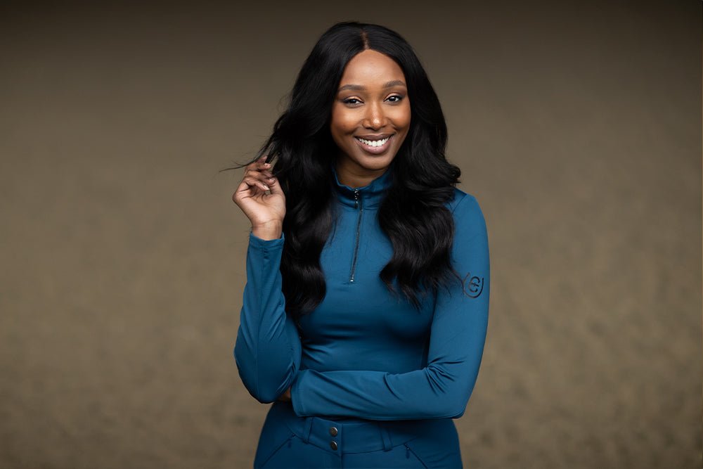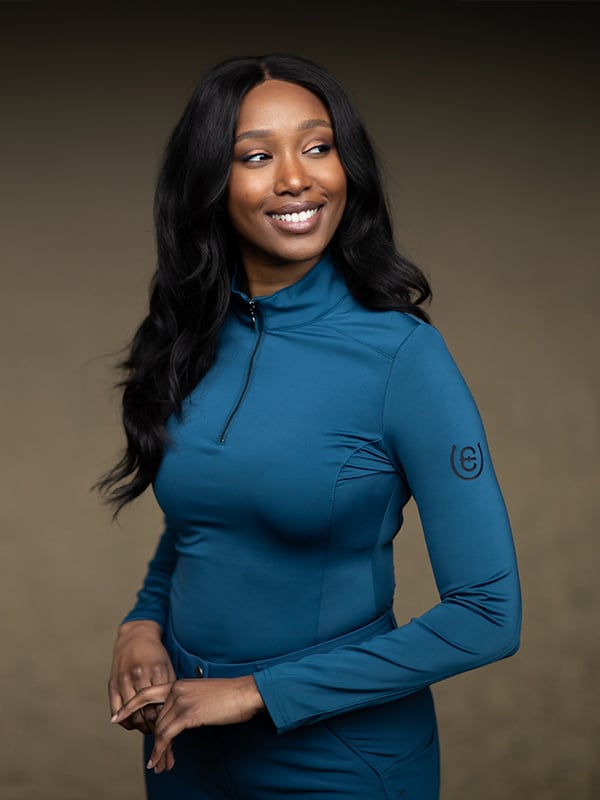 Finished off with a vertical Equestrian Stockholm logo down the centre of the back, a comfortable zip neckline and long full coverage sleeves with a smaller logo on the left arm. The stitching detailing of the top is designed to flatter and fit beautifully.