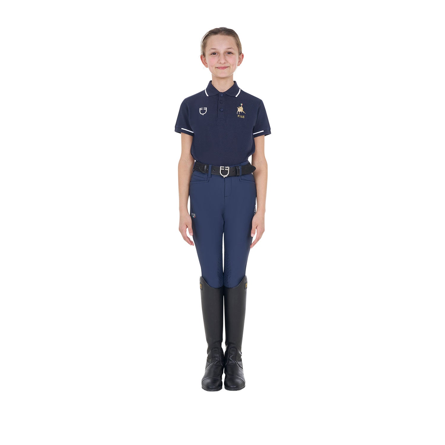 Equestro X FISE kids' polo shirt in super breathable technical fabric with short sleeves. Perfect for the summer season. The innovative fabric it is made of is able to facilitate the evaporation and dispersion of sweat, thus keeping the garment always dry and fresh.