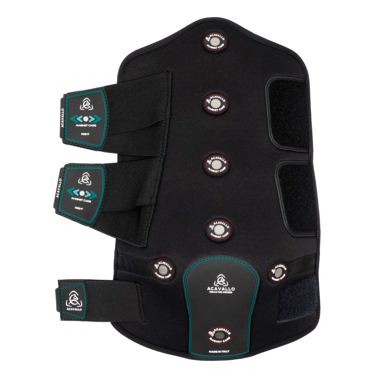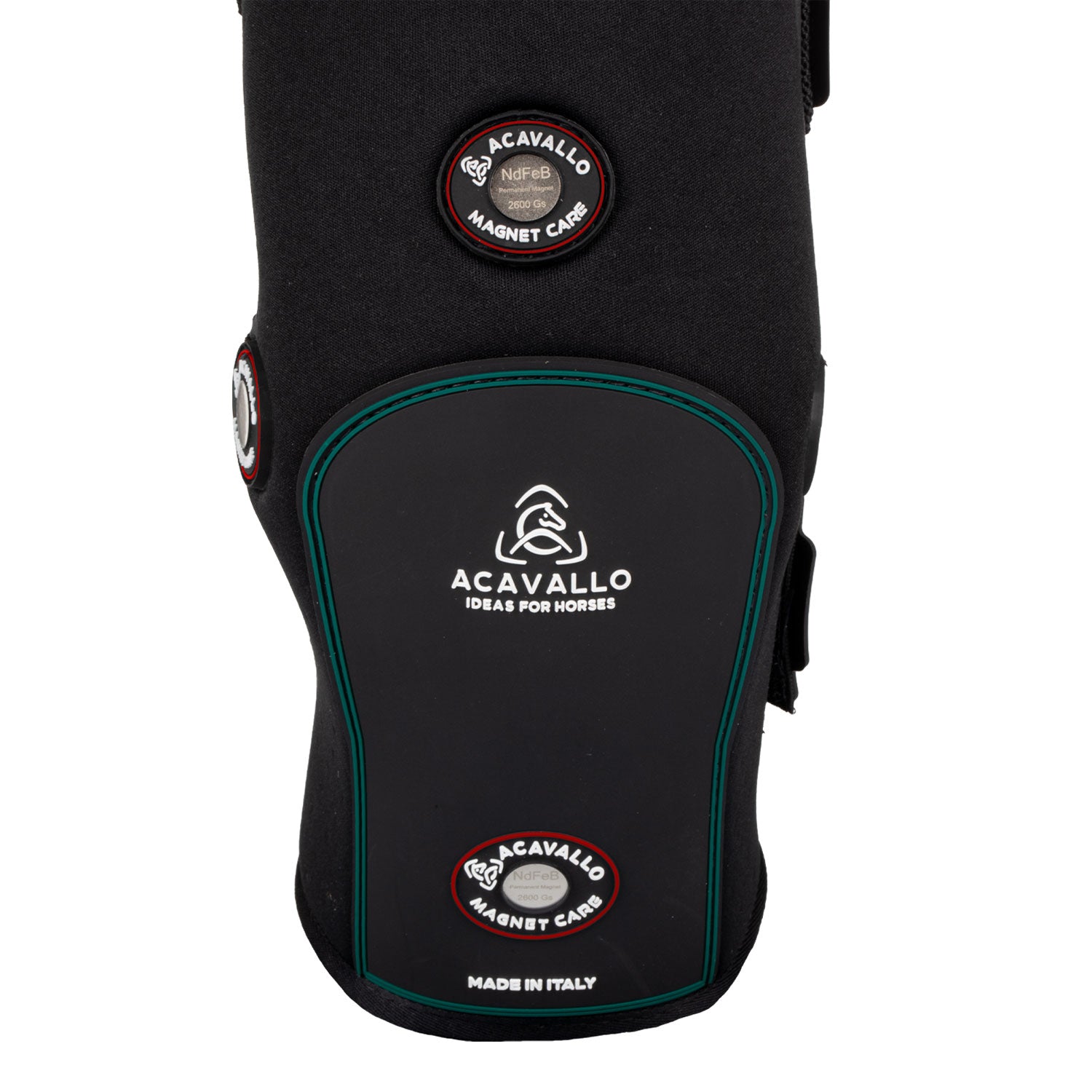 The specific layout of the magnets, their flux density, intensity and polarization were studied with the collaboration of vets and professional riders to maximize the localized increase in vascular blood flow and lymphatic circulation, with multiple beneficial effects.