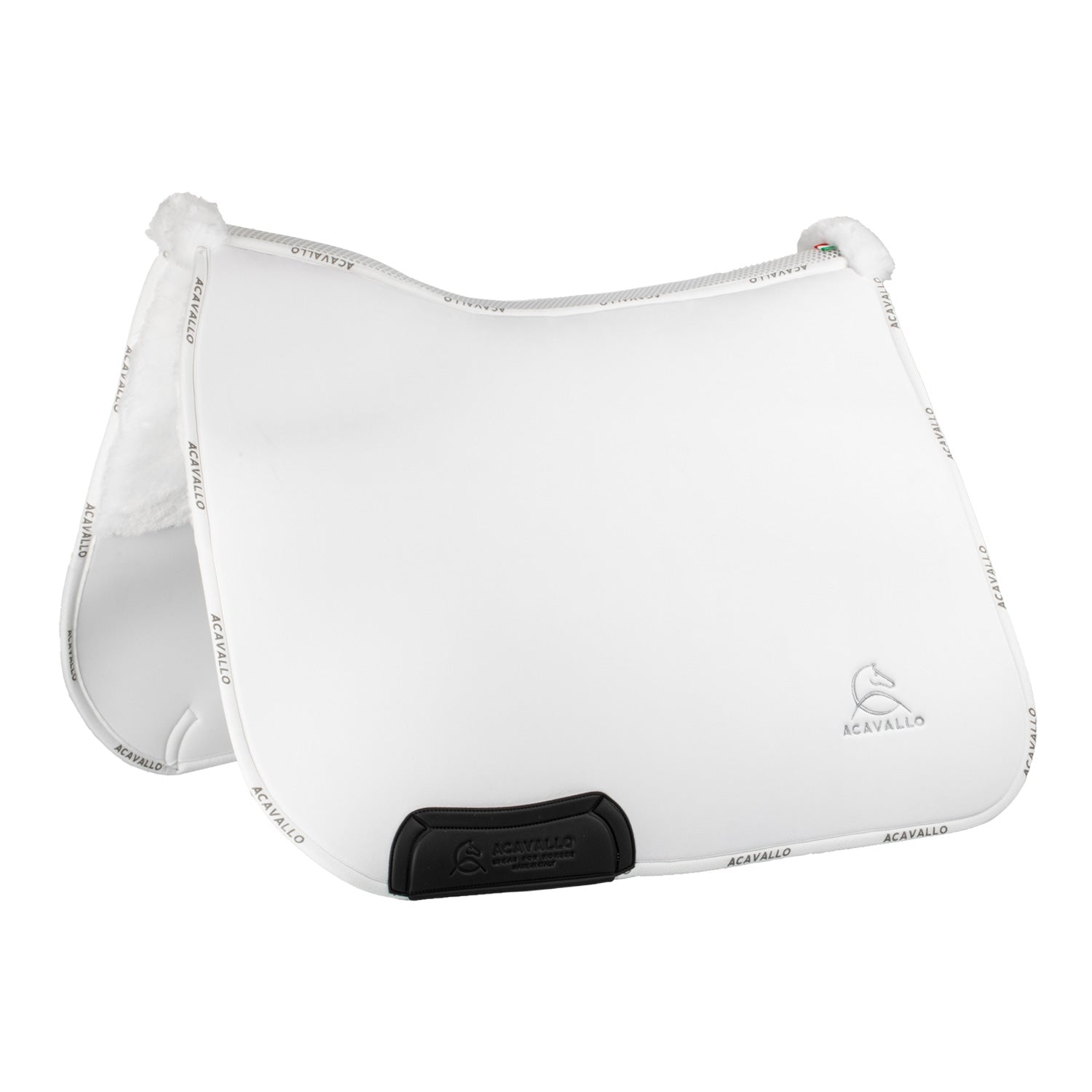 The Acavallo dressage saddle pad with classic withers and 3D spacer spine with shaped internal lining in faux sheepskin is characterized by louvre, a fabric highly appreciated for its shine and silky touch. The shape is not only aesthetically more elegant, but also more anatomical, and thus offers greater comfort.